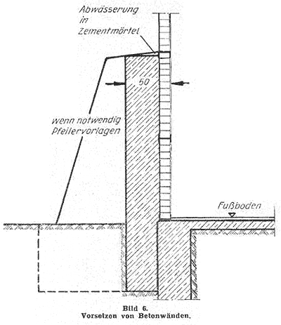 Die vorgesetzte Wand muß mindestens 65 cm dick sein. Die Zementmenge muß mindestens 100 kg/m³ fertigen Betons betragen. Die Säcke sind im verband zu verlegen, Hohlräume sind zu vermeiden.Vorgesetzte Splitterschutzwände, deren Höhe 2 m übersteigt, sind im allgemeinen durch Pfeilervorlagen zu sichern (vgl. Bilder 6, 7 und 8).