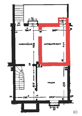 (2,83m x 4,11m; Bild links). Wie man den Grundrissen entnehmen kann, wurde hier zudem auf die eigentlich gewünschte Gasschleuse verzichtet.
