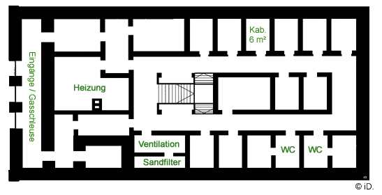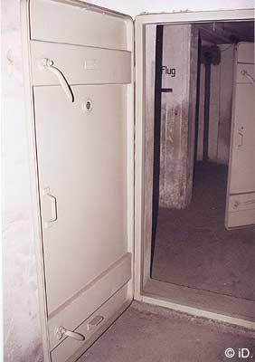 Gasschleusen gegen Brand- und Giftgase, die Eingangsbereiche knickten zum Schutz vor Detonationsdruckwellen und Splittern mehrfach ab. Als zusätzlicher Schutz