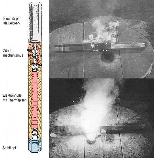 10-12 Minuten lang in einer grellweißen Flamme und unter großer Hitze (ca. 2500 Grad) abbrannte. Dabei wurde zuerst die Thermitfüllung entzündet, die später auch