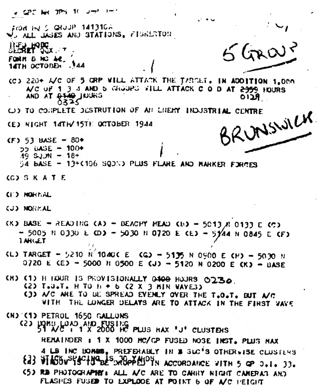 Am Sonnabend, dem 14. Oktober 1944, wurden im Hauptquartier der 5. Bombergruppe in Morton Hall bei Swinderby die Vorbereitungen für den Angriff abgeschlossen. Flugroute, Spritbedarf und präzise Angriffszeiten waren erarbeitet und festgelegt worden. Um 13:10 Uhr geht der Befehl mit den Anweisungen für die Operation über Fernschreiber an die beteiligten Bomberstaffeln heraus (Einsatzbefehl):