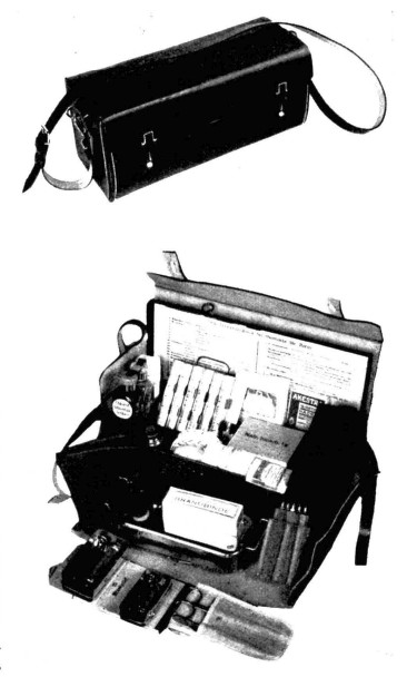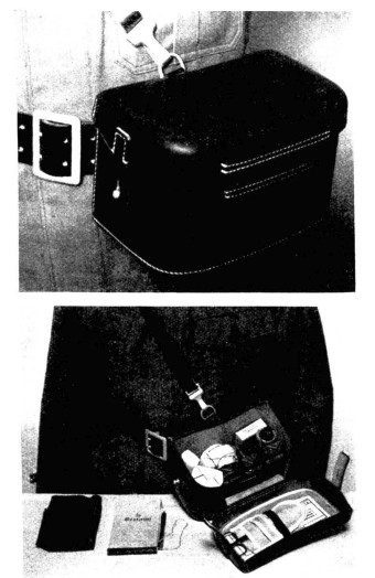 Ledertasche mit Trageriemen, darin Blechkasten (max. 320 x 130 x 100 mm) mit Unterteilungen für den Inhalt. Inhaltsverzeichnis im Deckel des Blechkastens verklebt. Die rezeptpflichtigen