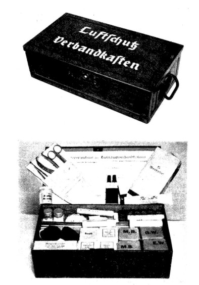 In der siebten Durchführungsverordnung zum Luftschutzgesetz wurde die Beschaffung von Selbstschutzgerät vorgeschrieben. Dazu gehörte auch die sog. Luftschutz-Hausapotheke.