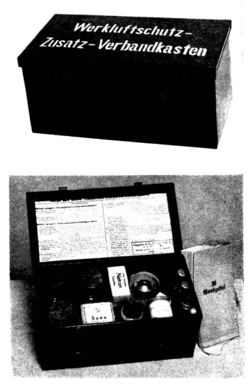 Luftschutz-Gastasche, für den Werkschutz der Werkluftschutz-Zusatz-Verbandkasten und für den Arzt der Sanitätsabteilung zusätzlich noch die