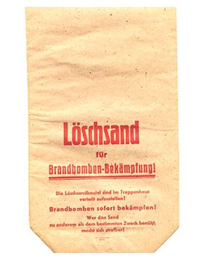 | Löschsand-Tüten | üblicherweise 2 Stück pro mittelgroßem Raum; verteilt auf Wohnungsflure und Treppenhaus (Inhalt einer Tüte: 5kg Sand) |