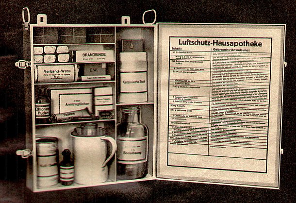 | Luftschutz-Hausapotheke | 1 Stück pro Treppenhaus mit vorgeschriebenem Inhalt |