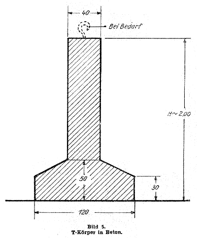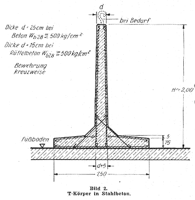 Die Ausführung erfolgt nach Nr. 4 (vgl. Bild 1 [A-Körper]) und Bild 2 [T-Körper]). Die Vorschriften über hochwertige Ausführung (§ 29,2 der DIN 1045) müssen erfüllt werden. Soll der innere Raum als Splitterschutzzelle benutzt werden, so muß die Einzelwand des A-Körpers splittersicher sein (s. Bild 3).- (2) Ausführung in Beton.