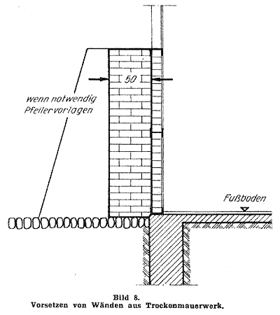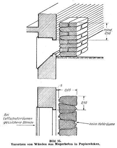 Die vorgesetzte Wand muß mindestens 65 cm dick sein. Die Zementmenge muß mindestens 100 kg/m³ fertigen Betons betragen. Die Säcke sind im verband zu verlegen, Hohlräume sind zu vermeiden.Vorgesetzte Splitterschutzwände, deren Höhe 2 m übersteigt, sind im allgemeinen durch Pfeilervorlagen zu sichern (vgl. Bilder 6, 7 und 8).