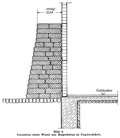 25 cm, wenn die bestehende Gebäudewand 38 cm dick ist; 38 cm, wenn die bestehende Gebäudewand 25 cm dick ist; 50 cm, wenn die bestehende Gebäudewand weniger als 25 cm dick ist.Magerbeton in Papiersäcken (vgl. Bild 9).
