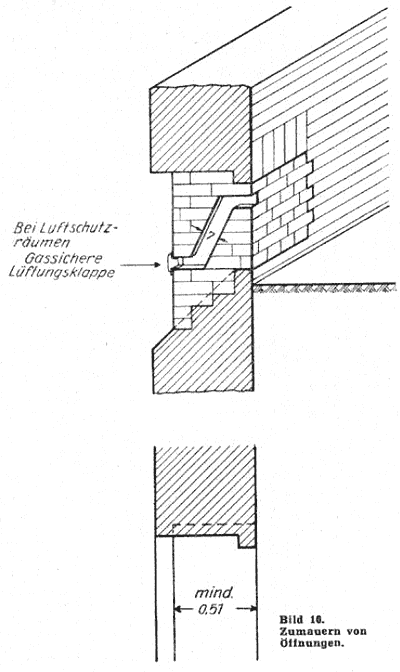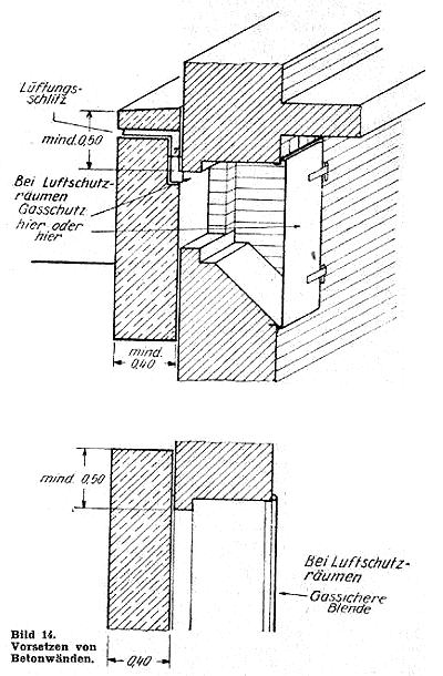 Die Lüftung der Räume darf durch Splitterschutzmaßnahmen nicht unmöglich werden. Bei dicken Splitterschutzwänden ist die Anlage eines Z-förmigen Luftungsschlitzes mit einem Querschnitt von nicht größer als 14 x 7 cm vorzusehen (vgl. Bilder 10 und 11). In den übrigen Fällen ist die Lüftung durch Abrücken der Splitterschutzwand von der Wand sicherzustellen (etwa 5 cm). Ein gasdichter Verschluß der Lüftungsöffnungen von Luftschutzräumen muß in jedem Falle möglich sein.