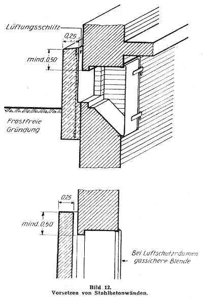 Die Dicke des Splitterschutzes, der aus der bestehenden Gebäudewand und der neuen Splitterschutzwand besteht, muß 50 cm betragen. Die Betonwand allein muß mindestens 25 cm dick sein.Mauerwerk (vgl. Bild 7).
