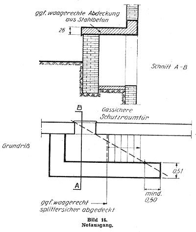 Die Überdeckung seitlich der Öffnung muß so groß sein, daß Splitter nicht in den Raum gelangen können (s. Grundriß in Bild 16). Die Überdeckung oberhalb der Öffnung muß mindestens 0,50 m betragen. Waagerechte Abdeckungen sind empfehlenswert, wenn Bauten gegenüberliegen.